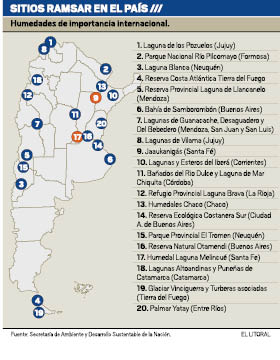 En nuestro país existe una gran diversidad y abundancia de humedales distribuidos a lo largo y ancho de todo el territorio. A modo de ejemplo, pueden mencionarse las lagunas salinas de la Puna, la llanura aluvial del Río Paraná, incluyendo el Delta, los esteros y bañados de la Región Chaqueña, las lagunas de la Pampa Húmeda, las costas de agua dulce y salobre del Río de la Plata, la costa marina desde las playas de arena de la provincia de Buenos Aires hasta los acantilados y playas de canto rodado de la Patagonia, y las turberas de Tierra del Fuego.