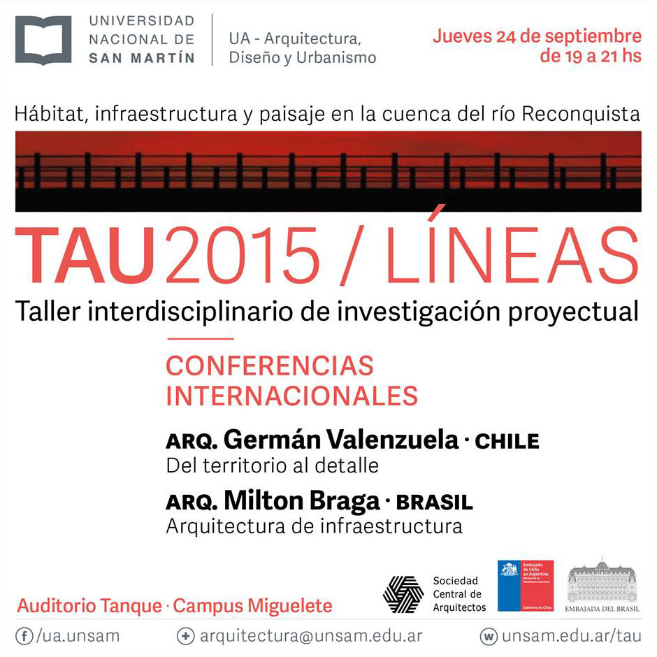 TAU 2015, Territorio Reconquista, es una experiencia proyectual pluridisciplinaria, que plantea generar una información, cuya sustancia conlleve dos direcciones; una que proponga la multiplicidad del saber, desde la desagregación a la integración del conocimiento, y otra que propugne la construcción de una red de actores de conocimiento y de experiencias, vinculadas ellas para crear condiciones que permitan transformar el territorio a través de la elaboración por parte del taller de Lineamientos Proyectuales en la Cuenca.
