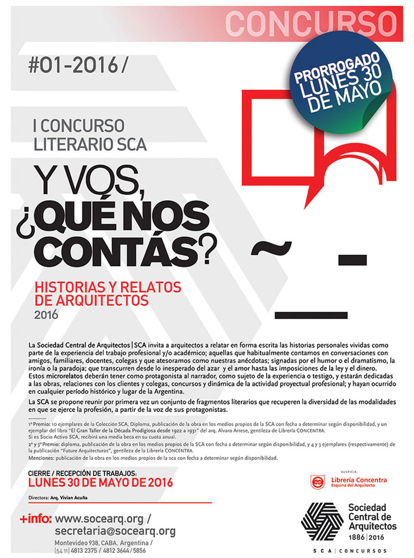 La Sociedad Central de Arquitectos invita a todos los arquitectos argentinos y extranjeros a relatar en forma escrita las historias personales vividas como parte de la experiencia del trabajo profesional y/o académico; aquellas que habitualmente contamos en conversaciones con amigos, familiares, docentes, colegas y que atesoramos como nuestras anécdotas; signadas por el humor o el dramatismo, la ironía o la paradoja; que transcurren desde lo inesperado del azar y el amor hasta las imposiciones de la ley y el dinero.