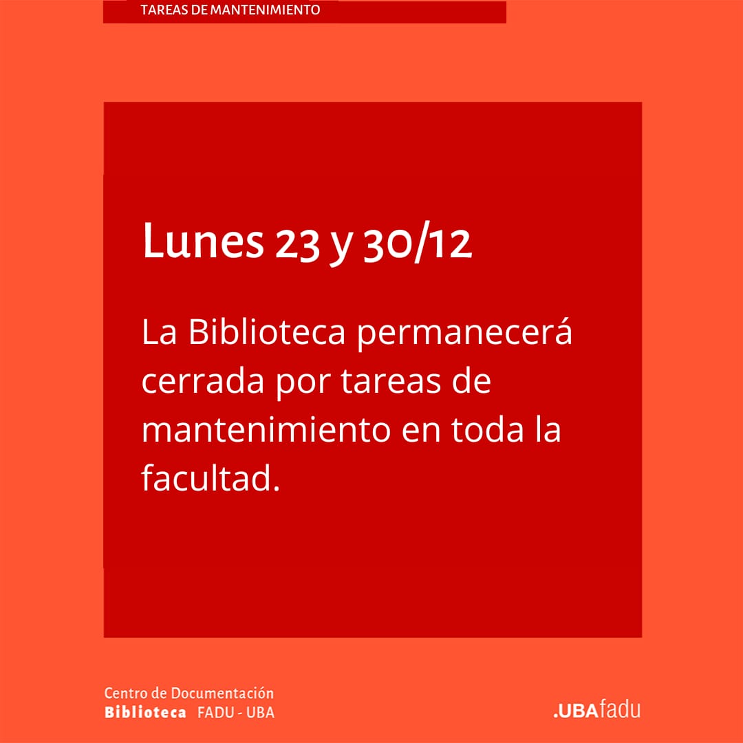 Los dias 23 y 30 de Diciembre la biblioteca permanecerá cerrada por tareas de mantenimiento en la facultad. |