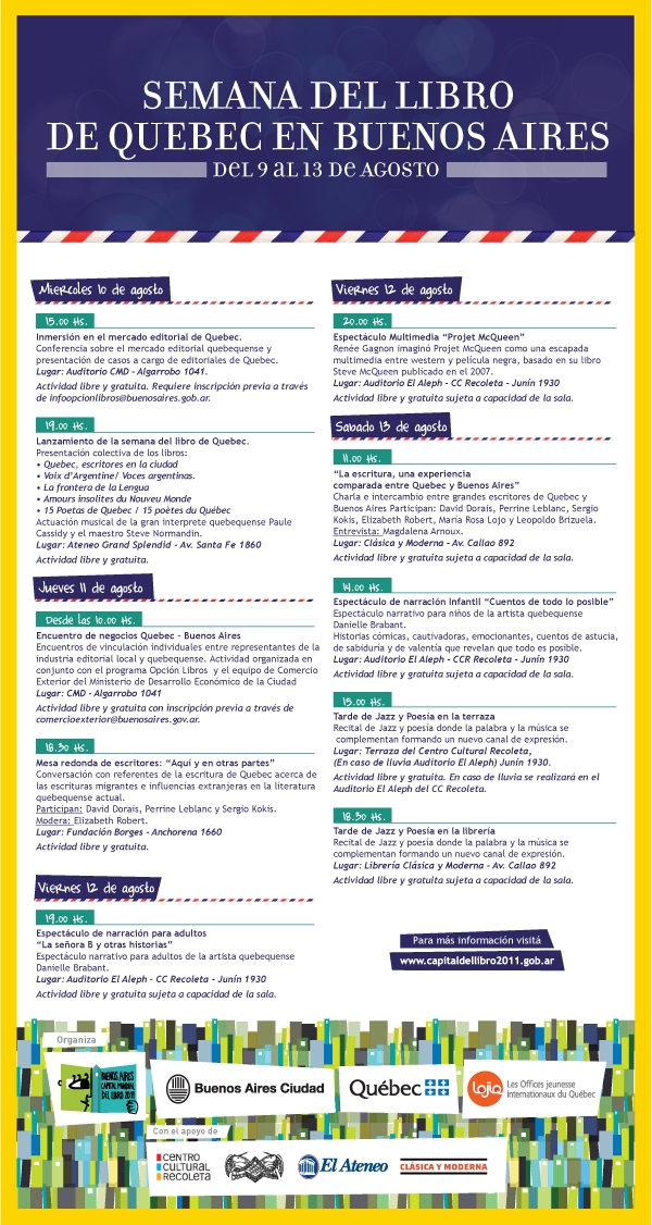 Con la visita internacional de escritores, editores, narradores, músicos y artistas, el programa que se desarrollará del 9 al 13 de agosto, ofrece una gran cantidad de actividades que buscan acercar al público a las letras de Quebec con espectáculos multimedia, charlas, mesas redondas, presentaciones de libros, narraciones, espectáculos de jazz y poesía, entre otras propuestas.