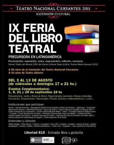 La IX Feria del Libro Teatral que organiza el área de Extensión Cultural del Teatro Nacional Cervantes, se ha convertido en un importante acontecimiento que desde su primera edición en 2003 ha ido creciendo año tras año por la conciencia que han adquirido los teatristas, estudiantes, investigadores, entidades públicas y privadas, y público en general, de que el libro, las publicaciones especializadas y la documentación teatral son herramientas técnicas, teóricas y críticas indispensables, que trascienden la difusión del texto dramático o el de los lenguajes disciplinarios.