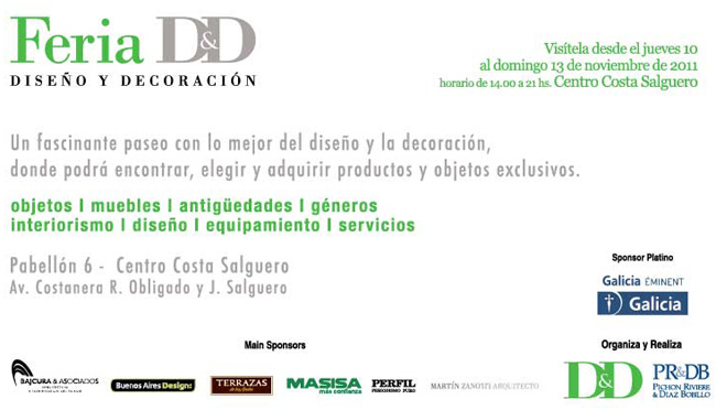 Entre las principales novedades de la Feria D&D 2011 ha de mencionarse un Homenaje al Cine Argentino que realizará un selecto grupo de arquitectos y diseñadores de interiores. Así como un sector consagrado a los anticuarios, lo cual significa una oportunidad de compra única para todos los aficionados a los muebles y objetos con la gracia de la pátina del tiempo, que jamás perderán su vigencia.