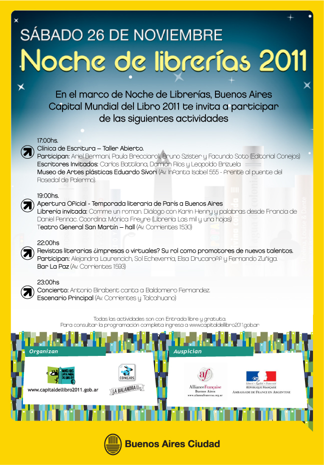 Una noche al año la calle Corrientes entre Av. Callao y Talcahuano se convierte en peatonal para albergar las distintas actividades culturales que ganan la calle. Además, las librerías y los bares más emblemáticos de la avenida sirven de sede a presentaciones de libros, mesas redondas y otros eventos culturales.