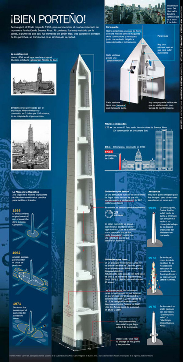 , que lo describió como una “simple y honesta forma geométricaâ€. Las obras comenzaron el 19 de marzo de 1936 y su construcción demoró solamente 60 días ya que se utilizó cemento de endurecimiento rápido y se fue construyendo por secciones de dos metros para facilitar el volcado del hormigón. El obelisco fue inaugurado el 23 de mayo de 1936 y el descubrimiento estuvo a cargo del presidente Agustín P. Justo