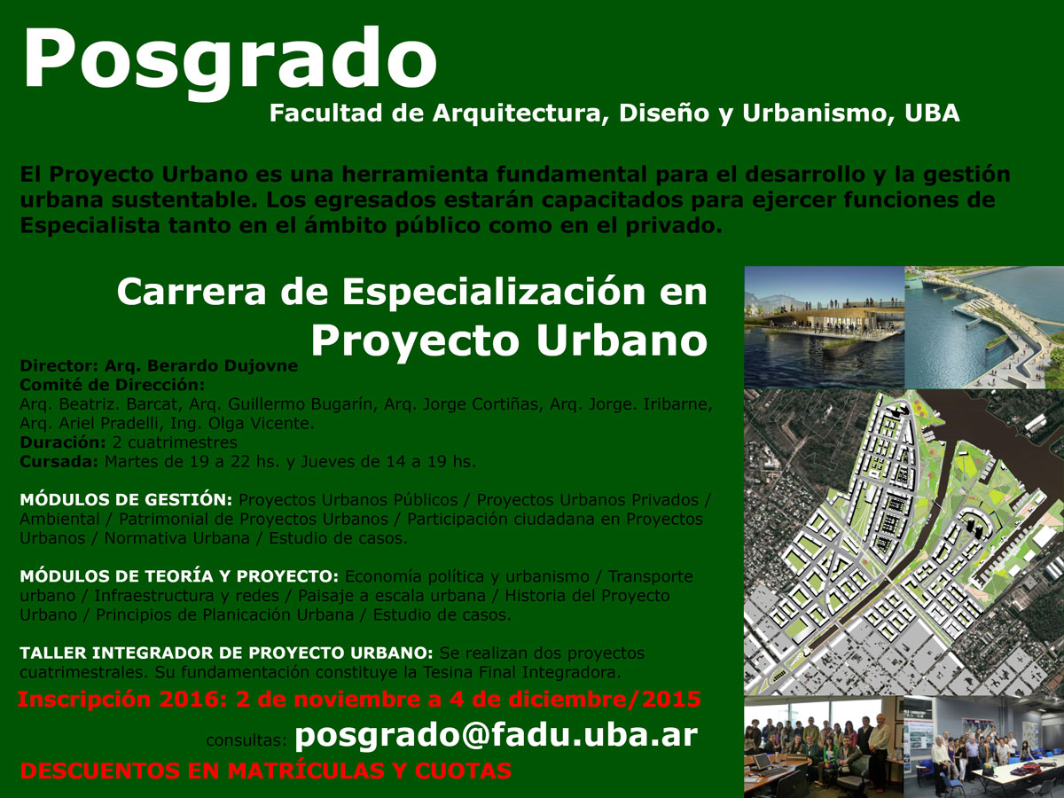 Modulos de teoria y proyecto: Economía política y urbanismo, Transporte urbano, Infraestructura y redes, Paisaje a escala urbana, Historia del Proyecto Urbano, Principios de Planicación Urbana, Estudio de casos.