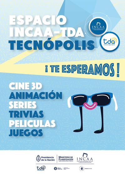 El Ministerio de Planificación Federal, Inversión Pública y Servicios en conjunto con el Instituto Nacional de Cine y Artes Audiovisuales inaugurarán el Espacio INCAA TDA Tecnópolis. De miércoles a domingos y feriados de 12 a 20 hs el público podrá asistir y realizar un recorrido que cuenta con un adelanto de series de TDA –documentales, ficciones y animación–, una selección de cine 3D producido en Argentina y juegos y trivias.