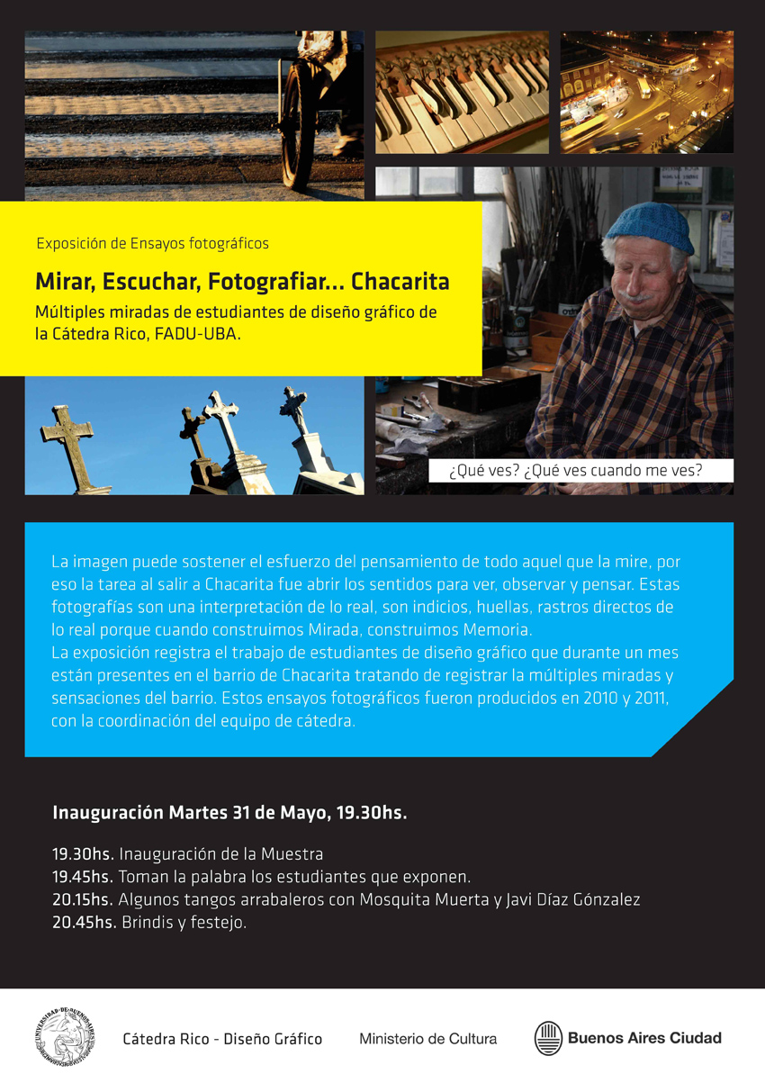 Realizado por estudiantes de Diseño Gráfico de la Cátedra Rico, FADU-UBA, coordinados por Esteban Rico. La imagen puede sostener el esfuerzo del pensamiento de todo aquel que la mire, por eso la tarea al salir a Chacarita fue abrir los sentidos para ver, observar y pensar.