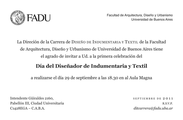 Los días 28, 29 y 30 de septiembre en la Sala del Consejo se hará una muestra de diseños de egresados destacados como Pablo Ramírez, Mariana Dappiano, Valeria Pesqueira, Cora Groppo, Vicky Otero, Vero Ivaldi, entre otros.
