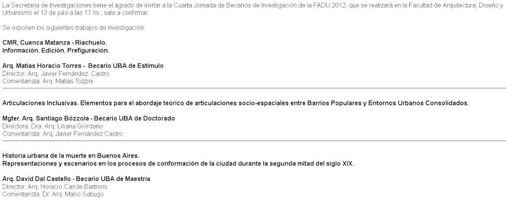La Secretaría de Investigaciones tiene el agrado de invitar a la Cuarta Jornada de Becarios de Investigación de la FADU 2012, que se realizará en la Facultad de Arquitectura , Diseño y Urbanismo , el 13 de Julio a las 17 hs.,sala a confirmar. |