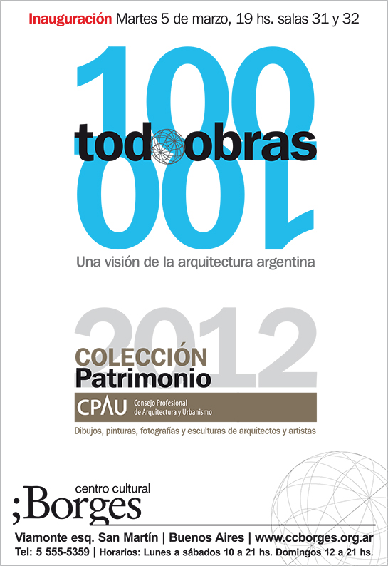 El Martes 5 de marzo a las 19hs. en las salas 31 y 32 del Centro Cultural Borges (Viamonte esq. San Martín) se inaugurará la Colección de Patrimonio CPAU 2012, con distintos dibujos, pinturas, fotografías y esculturas de diversos artistas especializados en la arquitectura. |