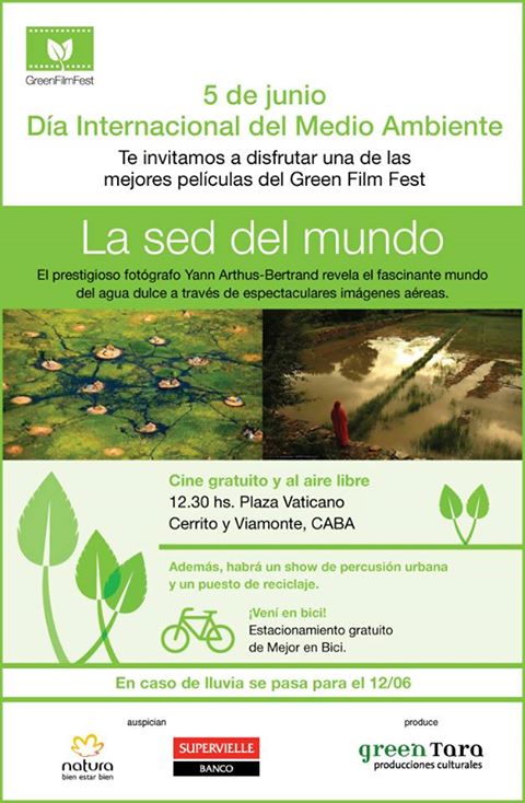 Green Tara y Mejor en Bici te invitan a celebrar el Día Internacional del Medio Ambiente con la proyección de una de las mejores películas presentadas en la pasada edición del Green Film Fest, La Sed del Mundo de Yann Arthus-Bertrand?. La proyección se realizará en pantalla gigante y al aire libre en la Plaza Vaticano (Av. Cerrito y Viamonte), con entrada gratuita.