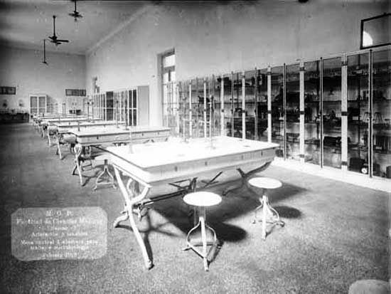 La muestra exhibe imágenes de algunas facultades de la UBA en el período 1910 – 1940, incluyendo fachadas, aulas, laboratorios, talleres, museos y otros espacios interiores.