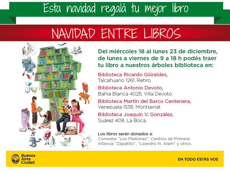 Los interesados en colaborar y sumarse a la campaña “Navidad entre Libros. Esta Navidad regalá tu mejor libro†pueden acercarlos a las siguientes bibliotecas, de lunes a viernes de 9 a 18 horas.